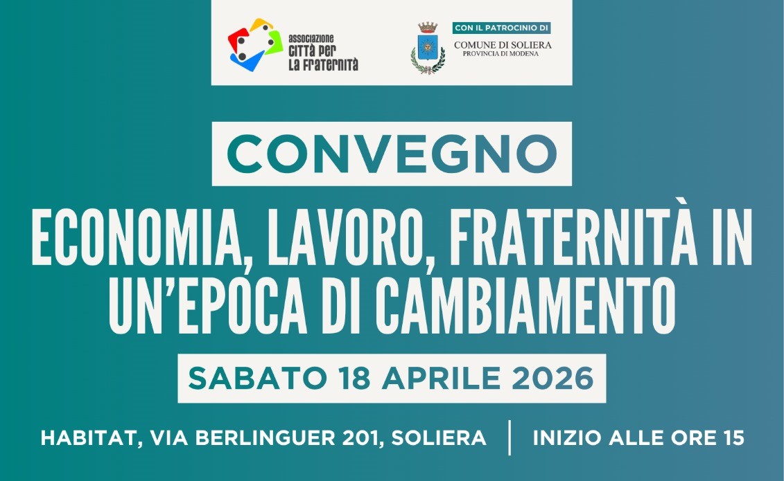 Si svolgeranno sabato 18 aprile gli appuntamenti annuali dell’Associazione con il patrocinio della Città di Soliera: il Convegno con relatori di eccezione e a seguire la cerimonia del Premio Chiara Lubich per la fraternità.