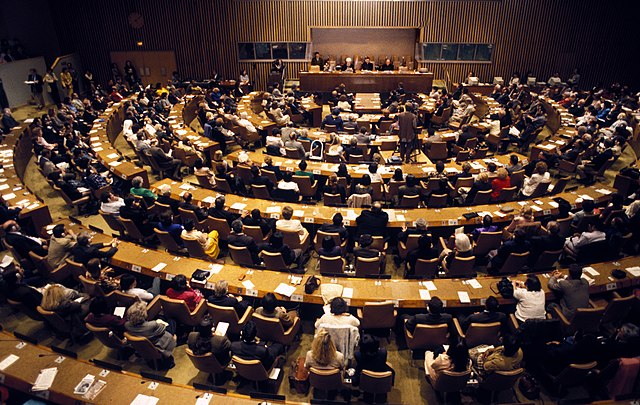 28 maggio 1997. Chiara Lubich interviene nella sede delle Nazioni Unite, esortando a divenire tutti costruttori di pace e testimoni di unità, a partire dal proprio ambiente di vita fino alle istituzioni globali come le Nazioni Unite, per promuovere l’unità e la fraternità.