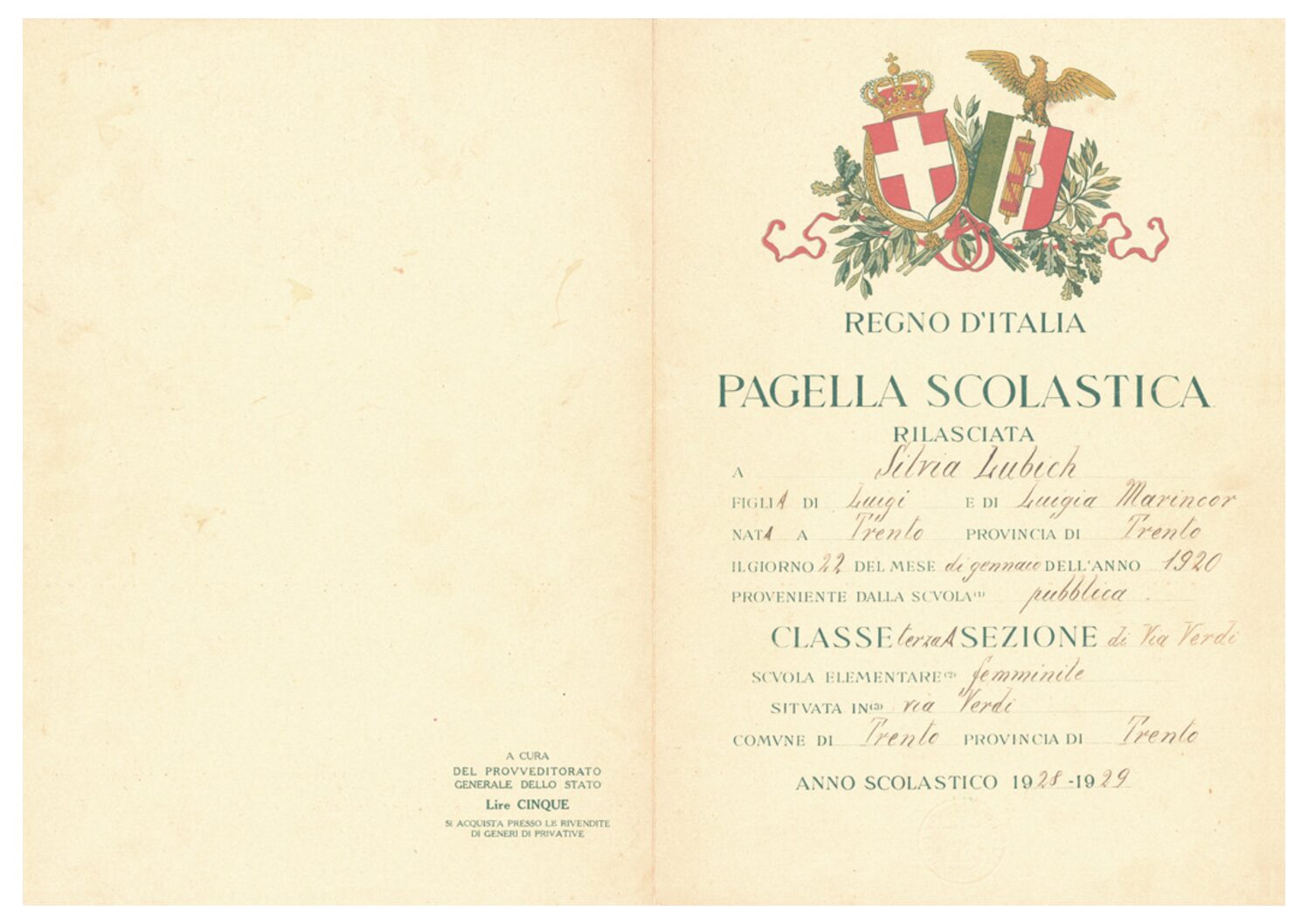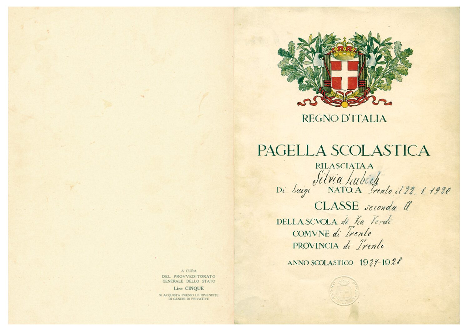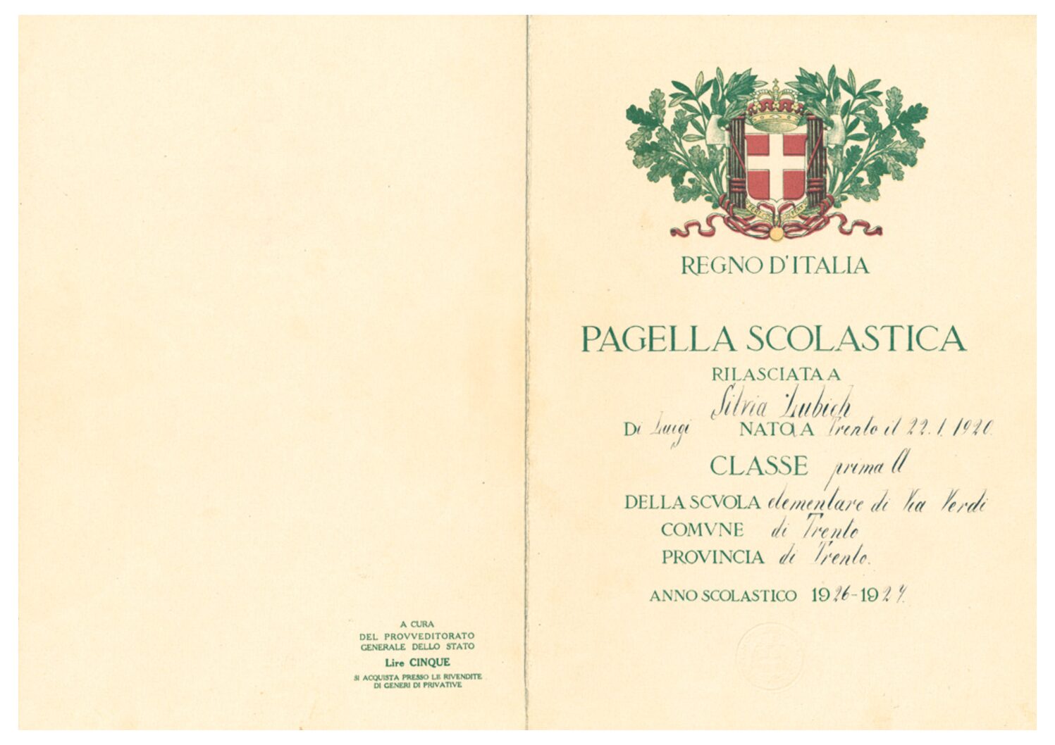 Dall’ottobre 1926 al giugno 1931 Chiara frequenta la scuola elementare “G. Verdi”.